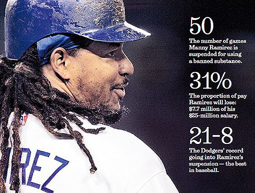 Manny Ramirez, the Dodgers’ most talented and most popular player, is banned from baseball for 50 games after flunking a drug test. Ramirez, whose effervescent attitude and lethal bat had made him the face of this storied franchise, is labeled a cheater before a largely adoring fan base at Dodger Stadium.