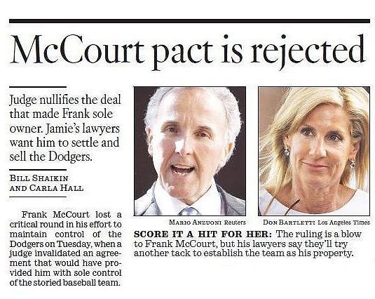 The judge in the divorce case invalidates the postnuptial marital property agreement that Frank McCourt claimed provided him with sole ownership of the Dodgers. In the wake of this decision, McCourt’s lawyers say he will use other legal avenues to establish his sole ownership of the Dodgers, while Jamie McCourt’s lawyers say she will be confirmed as the co-owner of the team as community property of their marriage.