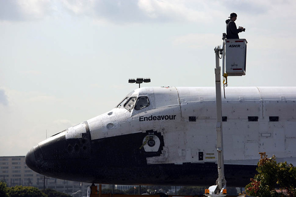 As workers prepared to move Endeavour from its specialized transporters to the dollies that would carry it over the 405 Freeway, Manchester Boulevard could have been mistaken for Hollywood.