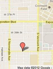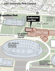 Space shuttle Endeavour within sight of Exposition Park