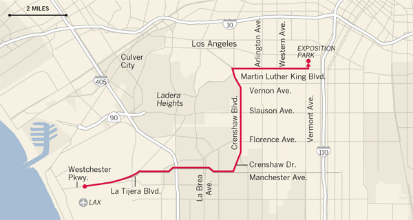 At the corner of Manchester Boulevard and Glasgow Avenue, three transmission lines attached to a hook on a 90-ton crane lifted up the wires to make room for the five-story-tall shuttle. A yellow measuring tape dangled from the lowest wire as crews made sure the shuttle had at least 70 feet of clearance.