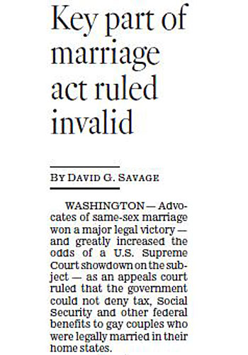 The U.S. 2nd Circuit Court of Appeals in New York strikes down part of the Defense of Marriage Act and becomes the first to say that gays and lesbians are a minority group deserving of special protection from discrimination under the Constitution.