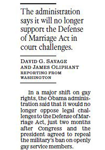 The Obama administration endorses a constitutional right to marry for gays and lesbians, urging the Supreme Court to strike down California’s voter-passed law barring same-sex marriage as well as laws in at least the seven other states that already provide civil unions. “Tradition, no matter how long established, cannot by itself justify a discriminatory law,” the administration said in a brief filed with the high court. “Prejudice may not be the basis for differential treatment under the law.”