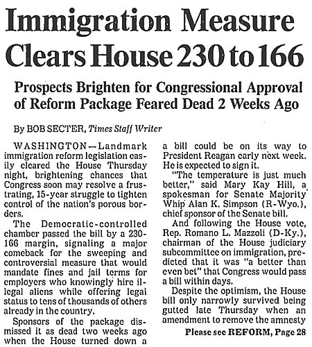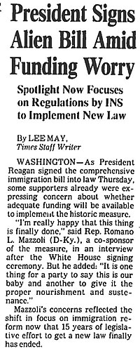President Reagan signs into law the Immigration Reform and Control Act. Considered to be the most sweeping reform in more than 30 years, the legislation offers legal residency to most illegal immigrants who have resided continuously in the United States since before Jan. 1, 1982.