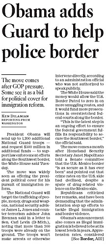 The National Guard will target the trafficking of people, money, drugs and weapons, national security advisor James L. Jones and counterterrorism advisor John Brennan said in a letter to Sen. Carl Levin (D-Mich.), noting that more than 300 troops were already on the ground. The troops won’t make arrests or otherwise intervene directly, according to an administration official who was not authorized to speak publicly.