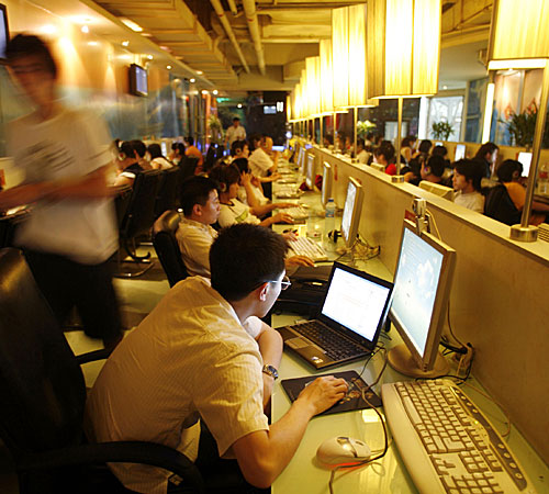 Customers use computers at an Internet cafe in Shanghai on Nov. 15, 2008.