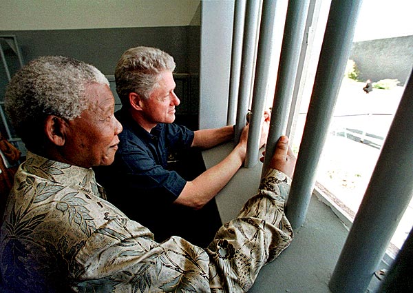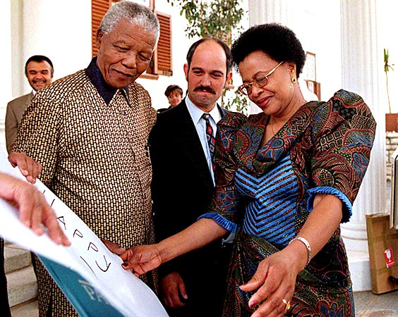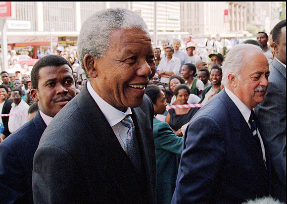 Mandela is sworn in as South Africa’s first black president by Chief Justice Michael Corbett in Pretoria. Princes, presidents and prime ministers — 6,036 dignitaries in all, from nearly every country in the world — watch as Mandela strides to the podium, carefully puts on his gold reading glasses and begins to read the 133-word oath of office with his left hand on a goatskin-covered Bible. Listen to Mandela’s inaugural speeech.