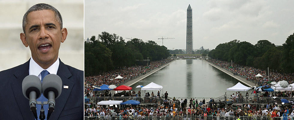 The president spoke at a ceremony commemorating the anniversary of the March on Washington for Jobs and Freedom, the 1963 protest that became the most iconic moment of the civil rights movement. Obama, the first African American president, spoke from the steps of the Lincoln Memorial, where King described his dream of racial equality as many black Americans still struggled to vote.