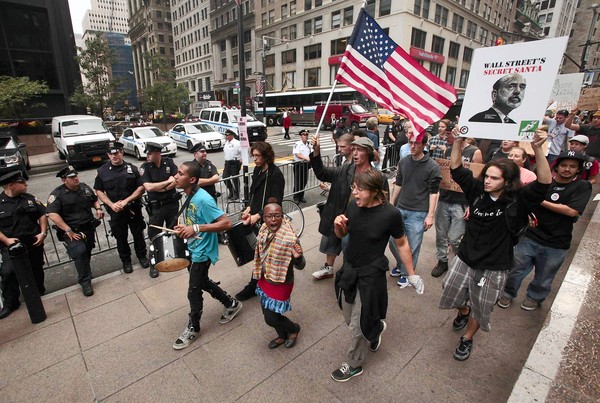 The idea catches on two months later when hundreds of people march along Broadway, demanding an end to Wall Street and corporate greed. About 150 people set up camp in Zuccotti Park, a privately owned space near Wall Street.