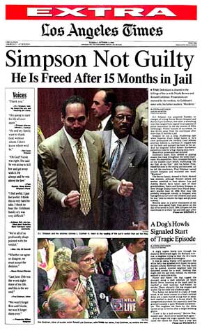 Less than a day after beginning deliberations in the murder trial of O.J. Simpson—and after having one witness’ testimony read back—jurors reach verdicts, a stunning announcement that shocks Simpson, legal analysts, police and the enormous national television audience that has been viewing the proceedings.