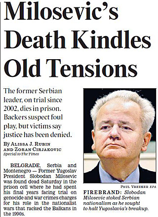 Former Yugoslav President Slobodan Milosevic is found dead in his prison cell at The Hague. Milosevic, 64, had been on trial on genocide charges for the “ethnic cleansing” campaign in Bosnia-Herzegovina and on charges of crimes against humanity and other war crimes for his role in the conflicts in Croatia and Kosovo.