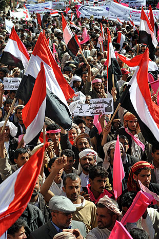 Inspired by the Tunisian uprising, tens of thousands of demonstrators march through Yemen's capital, Sana, protesting high unemployment and political oppression in the Arab world's poorest nation.