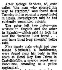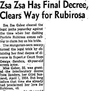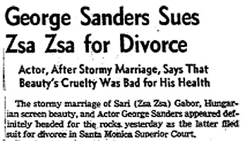 Gabor announces plans to wed actor George Sanders. They marry the following day in Las Vegas. The union is Gabor’s third and Sanders’ second. News reports say that by remarrying, she gave up $25,000 a year in alimony from Hilton.