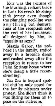 Gabor marries her fourth husband, industrialist Herbert L. Hutner. She says of the marriage: “I am going to work very hard to make it my last.” Hutner is chairman of the board of directors of Struthers Wells Corp. of Harrison, N.Y. This is Hutner’s second marriage.They divorce less than four years later.